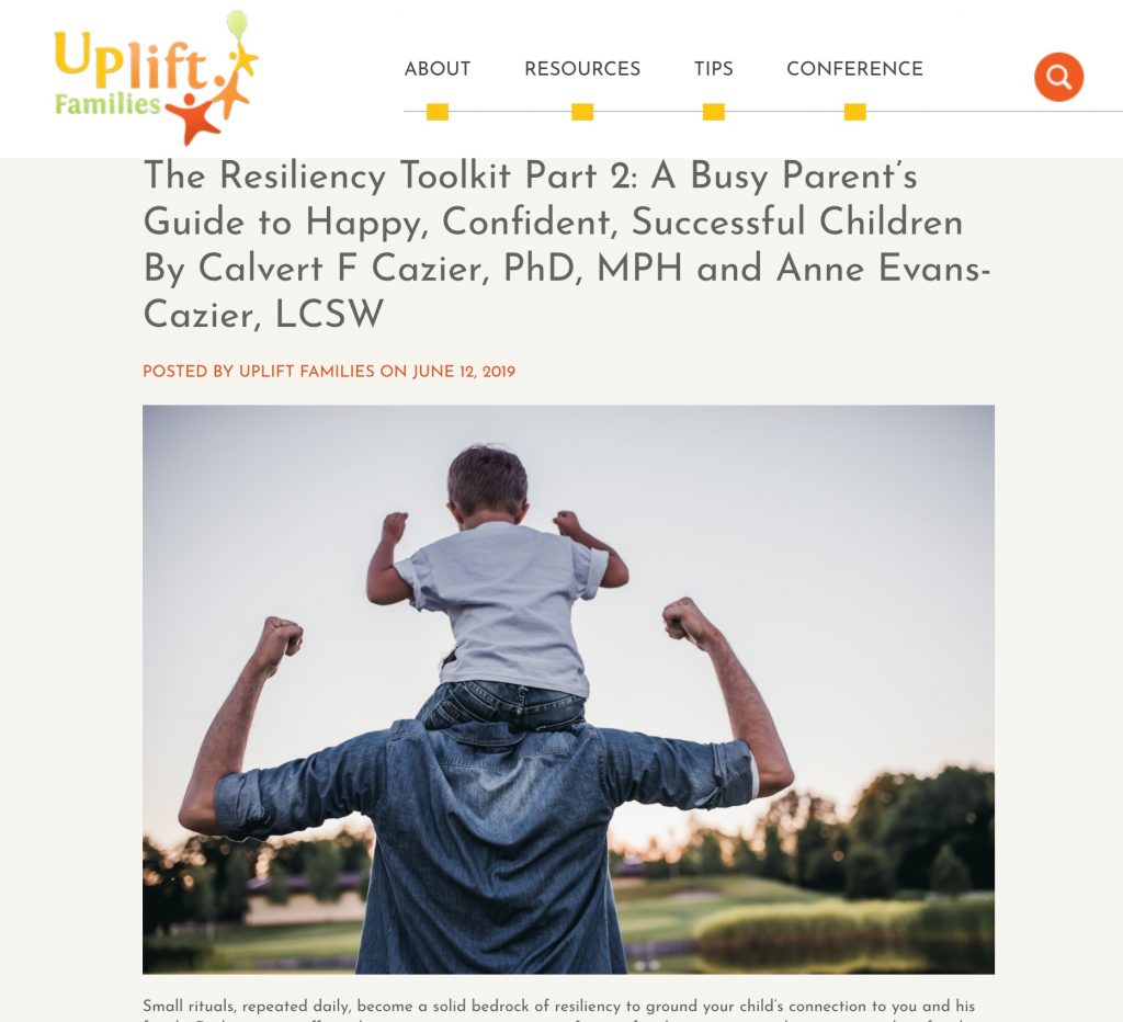 Uplift Families posted a second story in a three part story about the Resilency Toolkit. “Small rituals, repeated daily, become a solid bedrock of resiliency to ground your child’s connection to you and his family. Daily routines offer rich opportunities to create comforting, familiar patterns and expectations: how family members greet each other in the…